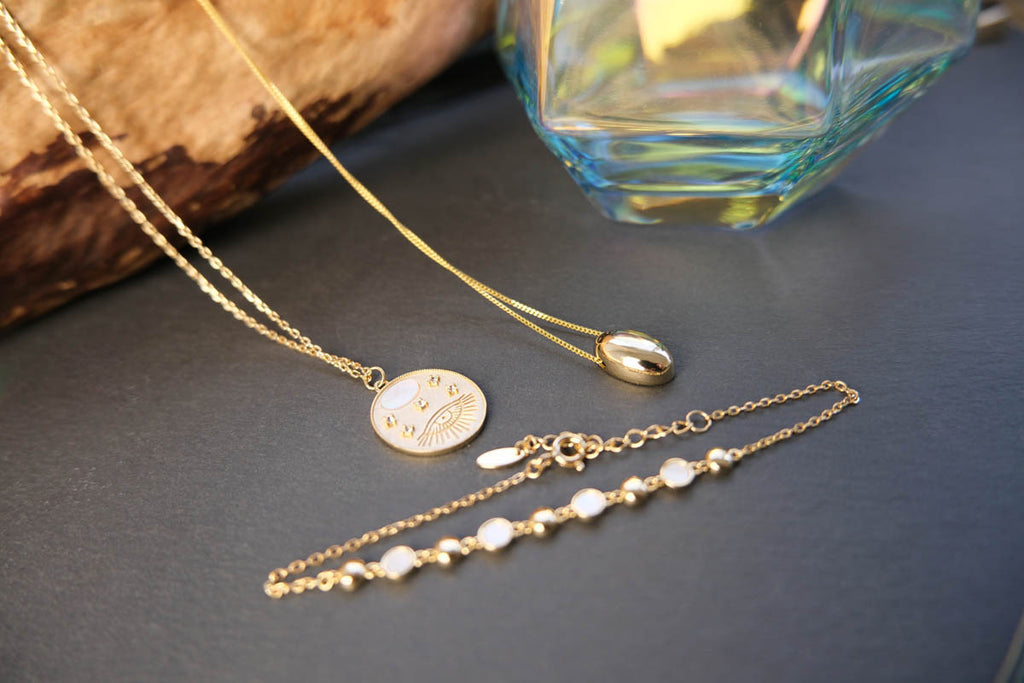 Dazu ein rundes Plättchen aus schimmerndem Perlmutt, das die Energie des Mondes in sich trägt: sanft, intuitiv, stetig im Wandel.