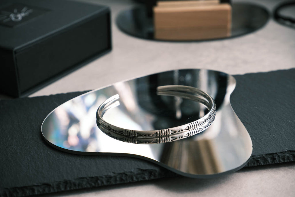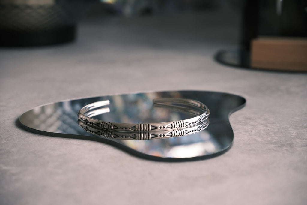 Nomad Whisper trägt das unsichtbare Element der Wüste in sich – den Wind. Er erzählt von Bewegung, Freiheit und dem Rauschen ferner Horizonte. Feine Gravuren erinnern an Wege, die nur von Wandernden gespürt werden. Dieser Armreif steht für die Kraft des Unfassbaren: leise, frei und doch allgegenwärtig.