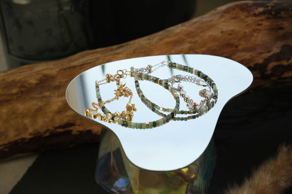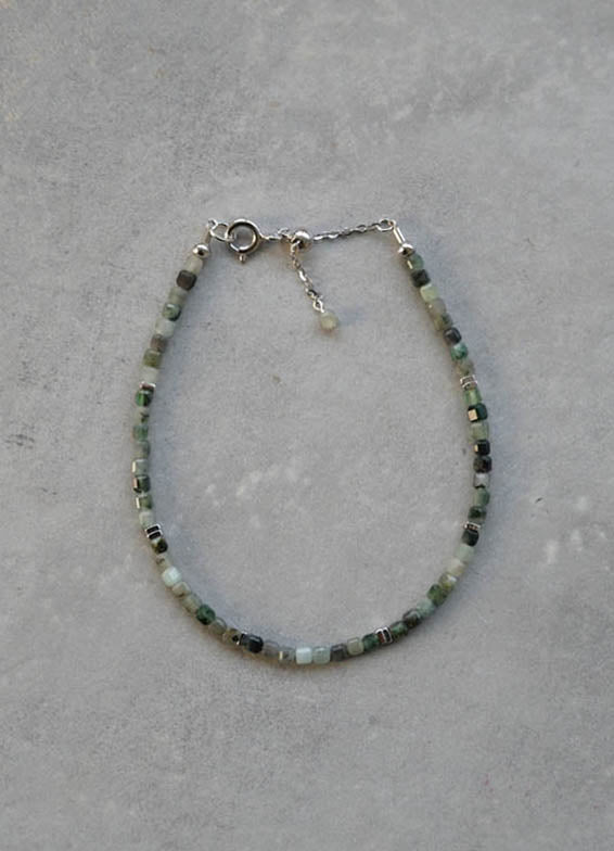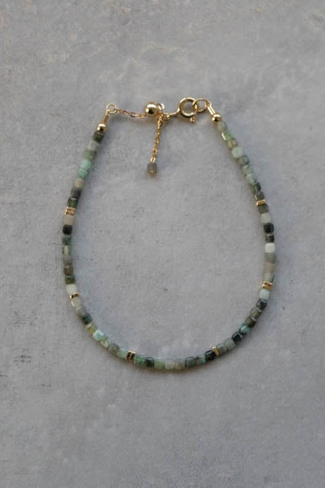 Dieses Armband besteht aus facettierten Smaragd-Würfeln – jeder Stein einzigartig, rau, lebendig. Die organischen Grüntöne reichen von tiefem Moos bis zu hellem Jadegrün.
