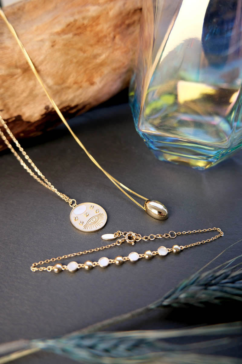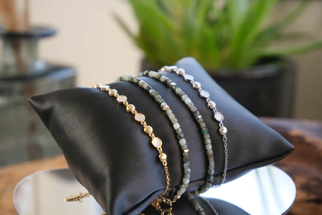 Feine Perlmutt-Inlays, eingefasst in edles Sterling Silber oder 18k Vergoldung, fügen sich zu einem eleganten Band aus Lichtreflexen. Die Oberfläche der kleinen Plättchen schimmert in sanften Weiß-, Creme- und Rosétönen – je nach Lichteinfall.